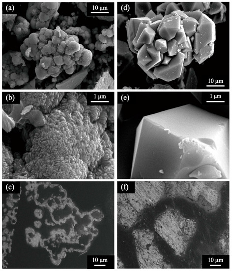 Figure 2. SEM images of (ac) bio- and (df) chemical- scorodite seed crystals at 2000× (a,d) or 20,000× (b,e) magnification. Cross-section views are shown at 3000× magnification (c,f).