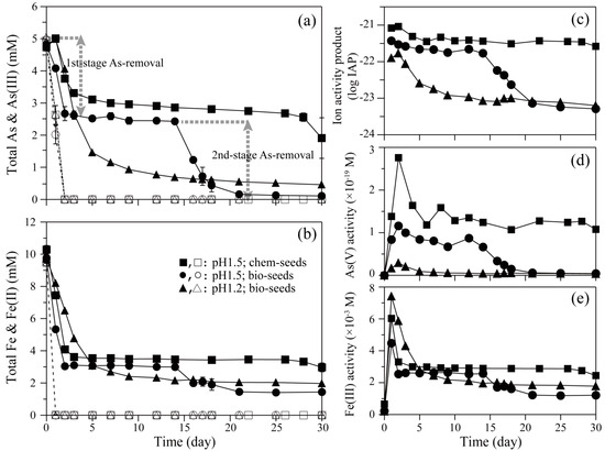 The supersaturation of scorodite was evaluated based on the ion activity product (IAP) (Figure 3c) calculated from Fe(III) and As(V) ion activities (Figure 3d,e). The log Ksp for scorodite was reported to be −25.8 [24]. The greater first-stage As-removal on bioscorodite seeds (than on chemical scorodite seeds; Figure 3a) led to the lower and stable supersaturation level during day 2–14 (Figure 3c), before a sudden second-stage As removal was triggered to produce crystalline scorodite (Figure 3a).