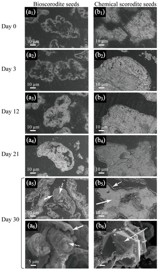 SEM cross section views revealed contrasting bioscorodite crystallization patterns on bio- (Figure 4(a1–a6) and chemical- scorodite seeds (Figure 4b). Hollow bioscorodite seed particles were found increasingly filled with newly formed scorodite (Figure 4(a1–a6)), whilst solid chemical seeds induced their surface to be thoroughly coated with new scorodite precipitates (Figure 4(b1–b6)).