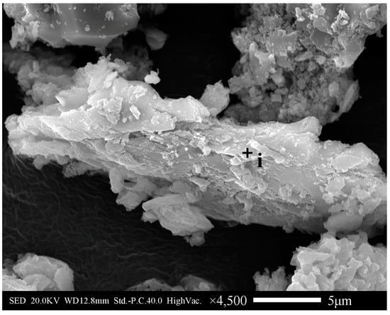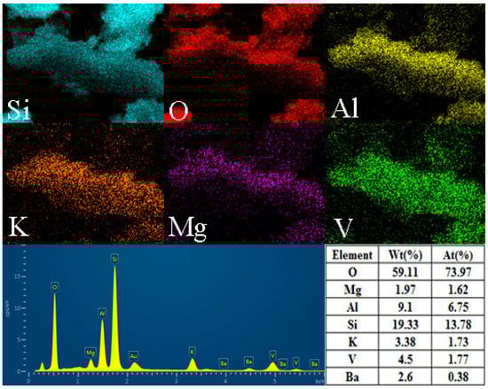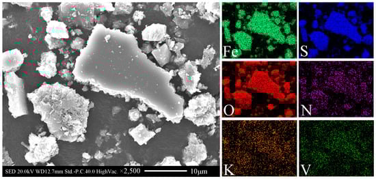 Research about the removal of vanadium from aqueous solutions has indicated that vanadium can be effectively removed by co-precipitation with iron (III) [31,32]. The removal mechanism of vanadium could be explained by a formal co-precipitation intended as the incorporation of vanadium in the iron particles formed by the addition of iron (III) and/or adsorption of vanadium on the iron (hydr)oxides surface [33]. To prove the adsorption or co-precipitation of vanadium and jarosite, the leachate was filtrated after leaching for 1.2 days, and the filtrate was put back to rotary shaker, shaken at 30 °C and 150 rpm until precipitates were formed. SEM-EDS analysis of the precipitates was conducted and the results are shown in Figure 10. The results indicated that the elemental distribution of O, S, Fe, K and N had obvious relevance, indicating that the precipitates consist of ammonium jarosite and potassium jarosite. Meanwhile, the relevance of V, O, S, and Fe indicated that the vanadium indeed existed in jarosite. Sarita H. Ahoranta et al. [34] adopted a simple approach to distinguish metals’ adsorption from co-precipitation with jarosite. Washing precipitates with dilute acid, metals adsorbed by jarosite may be released to the liquid phase. In this research, acid-washing of the jarosite (with de-ionised water adjusted to pH 1.0 with concentrated H2SO4) resulted in 31.6% of vanadium in the precipitates desorption, indicating that most of the vanadium was co-precipitated. These results indicated that the decrease of vanadium content in leachate was caused by both adsorption and co-precipitation.