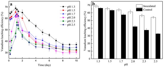 Vanadium leaching efficiency (a) and the highest vanadium leaching efficiency of the inoculated tests and that of the control tests (b) at different pH.