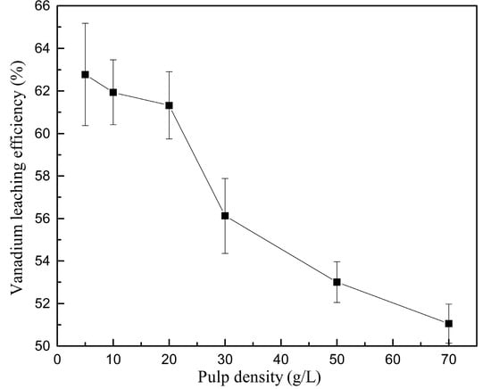 The effect of pulp density was studied at 5, 10, 20, 30, 50, 70 g/L. The vanadium leaching efficiency was found to be at a maximum on day 1 when the pulp density was 5–50 g/L, while it was observed in two days when the pulp density was 70 g/L. The bacterial activity can be evaluated indirectly through iron oxidation rate. Fe2+ was completely oxidized in two days at a different pulp densities. This indicated that the increase of pulp density has a minimal impact on the activity of the adapted A. ferrooxidans. The highest vanadium leaching efficiency of different pulp density over time is shown in Figure 4. The results indicated that vanadium leaching efficiency decreased with the increase of pulp density. About 61%–63% of vanadium has been leached from vanadium-bearing shale when pulp density was less than 20 g/L. Further increasing pulp density, vanadium leaching efficiency decreased markedly. In order to gain the maximum processing capacity, the pulp density of 20 g/L was appropriate.