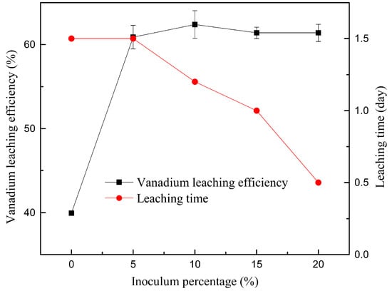 The effect of inoculum percentage from 5% to 20% on vanadium leaching efficiency is shown in Figure 6. Vanadium leaching efficiency remained nearly constant as inoculum percentage increased from 5% to 20%, while the time needed for vanadium leaching efficiency to reach its maximum decreased as it increased from 5% to 20%. It can be seen that more inoculums can accelerate the bioleaching rate. It is generally accepted that A. ferrooxidans mediates bioleaching of minerals through the contact and indirect mechanisms. The contact mechanism usually requires a few days to work out. The indirect mechanism occurs by sulfuric acid and Fe3+ produced by the microbe. In addition, 1.5 days were taken to obtain highest vanadium leaching efficiency, which did not follow the contact mechanism. Sulfuric acid has not been produced in this period. It was supposed that vanadium extraction followed the indirect mechanism, namely, Fe3+ produced by A. ferrooxidans promoted the dissolution of vanadium-bearing shale. Increasing the inoculum percentage could accelerate the oxidation of ferrous iron, resulting in more ferric irons in a short time, thus accelerating the bioleaching rate.