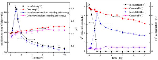 Vanadium leaching efficiency and pH (a), the concentrations of Fe3+ and Fe2+ (b) in leach liquors during the bioleaching of vanadium-bearing shale.