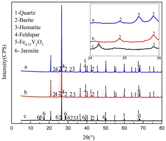 The main chemical compositions of the ore sample are shown in Table 1. It can be seen that Si (41.82%), Al (1.45%), Fe (1.14%), and V (0.73%) are the major elements. The XRD pattern of the sample shown in Figure 1 indicates that the main mineral phases are quartz, hematite, barite and feldspar.