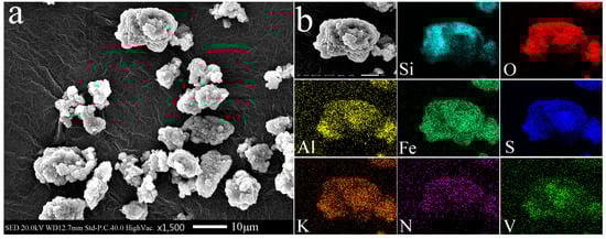 SEM-EDS analysis of leached residue obtained after 10 days was conducted and the results are presented in Figure 9. As shown in Figure 9a, the precipitate consisted of dominant cauliflower-like masses. Figure 9b shows the EDS element mapping of one of the particles. Si, O, S, Fe, K, N, Al and V had a good relevance in the view fields from the SEM-EDS elemental mapping images. Combined with the XRD analysis of the leached residue, the particle consisted of jarosite and silicoaluminate minerals in the raw ore. It was assumed that jarosite absorbed on the ore surface during the leaching process, and formed a passivation layer, resulting in few vanadium released into the leaching solution even when the pH decreased.