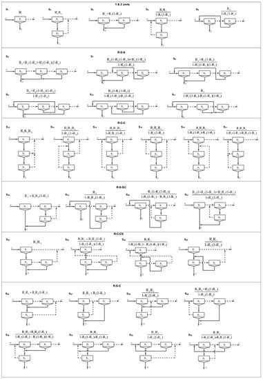 The signs of F, C, and T show the mass of particles with a specific property in feed, concentrate and tailings. R, C, and S, respectively, represent the rougher, cleaner, and scavenger stages. For all configurations, the numbering of the stages is started from the left to have the calculated recovery function in a specific order. Table 1 shows all possible recovery combinations in stages, six possible states, and the total recovery achieved with that circuit. Due to the structure of some circuits, their transfer function is in such a way that it does not matter how the recovery arrangement is in the stages. In these circuits, the overall circuit recovery will be the same in any way that the recovery is distributed in stages (S2, S3, S6, and S12 circuits). By increasing the amount of recovery in each of the stages of these circuits, the total recovery also increased. The S6 and S12 circuits have the highest and lowest overall recovery in the 33 circuits under investigation (0.88 and 0.26, respectively). By examining the circuits of Figure 3 and Table 1, it can be seen that all R-C-C type circuits show lower recovery than the single rougher stage. By adding a cleaner-scavenger unit to these circuits and creating R-C-CS circuits, the circuit recovery increases, but even in this situation, the overall circuit recovery is less than that of a single rougher unit.