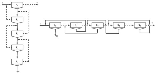 In mineral processing engineering, the circuit function can be directly used in optimizing the separation circuit. Establishing functional relationships between operational parameters, such as pulp density and the transfer function of a single unit, can easily be accomplished through empirical operations. Obtaining the recovery function for mineral separation circuits can lead to the simplification of complex flowsheets. When considering the recovery as a transfer function for each stage/bank (Ra and Rb), it is possible to calculate the transfer function of the circuit while using the manual method [26]. In Figure 2, a closed rougher-scavenger circuit, analytical solution can be obtained while using algebraic expressions.