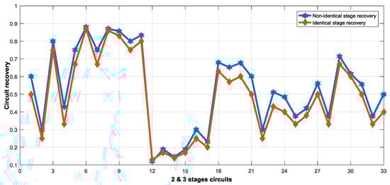 Comparison of the overall circuit recovery for two and three stages circuits in the case of identical and non-identical stage recovery.