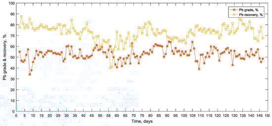 Grade and recovery of the flotation plant in 150 days of operation are shown in Figure 7. By sampling the input and output of each stage and calculating the recovery based on the two-product formula, the recovery values in the stages were 0.55, 0.70, 0.52, 0.61, 0.75, and 0.65, respectively. With regard to the evaluations that were carried out in the previous section, the first point that could be noted is the low recovery of the rougher stage in relation to the other stages. The transfer function of the circuit in Figure 6 is as follows:
