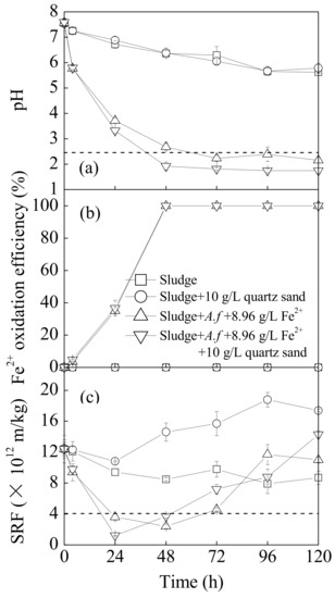 Using 1000 mL Erlenmeyer flasks, the sludge treatment is listed as follows: (1) 540 mL sludge + 60 mL deionized water; (2) 540 mL sludge + 60 mL deionized water + 10 g·L−1 quartz sand; (3) 540 mL sludge + 60 mL A. ferrooxidans LX5 + 44.2 g·L−1 FeSO4·7H2O; (4) 540 mL sludge + 60 mL A. ferrooxidans LX5 + 44.2 g·L−1 FeSO4·7H2O + 10 g·L−1 quartz sand. Each treatment was tested three times. The initial cell density in every flask was 5 × 107 cells·mL−1. The flasks were incubated in a gyratory shaker at 28 °C and 180 rpm for 120 h. Periodic samples were taken to monitor the sludge pH and dewaterability (characterized by SRF) during the process. With each sample, the flasks were shaken to mix the supernatant and were taken after 5 s for full sedimentation of quartz sand. The concentrations of Fe2+ were measured and its oxidation ratio was calculated via the following equation: Fe2+ oxidation efficiency (%) = (C0 − Ct)/C0 × 100%, where C0 is the initial Fe2+ concentration (g·L−1), and Ct is the Fe2+ concentration (g·L−1) at different times.