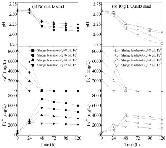 The index change (pH, Fe2+ and Fe3+ concentration) in the municipal sewage sludge with different treatments at 28 °C and 180 rpm for 120 h: (a) no quartz sand; (b) 10 g·L−1 quartz sand (initial pH = 2.55, Fe2+ concentration = 2–8 g·L−1, sludge leachate volume = 270 mL, A. ferrooxidans LX5 volume = 30 mL, A. ferrooxidans LX5 density = 5 × 107 cells·mL−1).