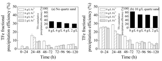 Figure 4 shows a comparison of the TFe fractional precipitation efficiency and accumulated precipitation efficiency with different treatments during different reaction periods. Essentially, in this process, the Fe3+ in the solutions was transferred from the liquid phase to the solid phase as it was hydrolyzed into secondary iron minerals during the bio-oxidation of Fe2+ [32]. Overall, introducing quartz sand or increasing the concentration of the energy source, Fe2+ in the bioleaching system improved the hydrolysis and sedimentation of Fe3+. For example, 10 g·L−1 of quartz sand could improve the TFe precipitation efficiency of system treated with 8, 6, 4, or 2 g·L−1 Fe2+ from 34.2%, 30.5%, 24.0%, and 21.9% to 85.3%, 69.9%, 68.3%, and 61.9%, respectively. In general, high concentrations of Fe3+ benefit the secondary iron mineral synthesis [33]. The results of this study indicated that a large number of secondary iron minerals could form in low Fe3+ concentrations when quartz sand is supplemented as crystal seed.