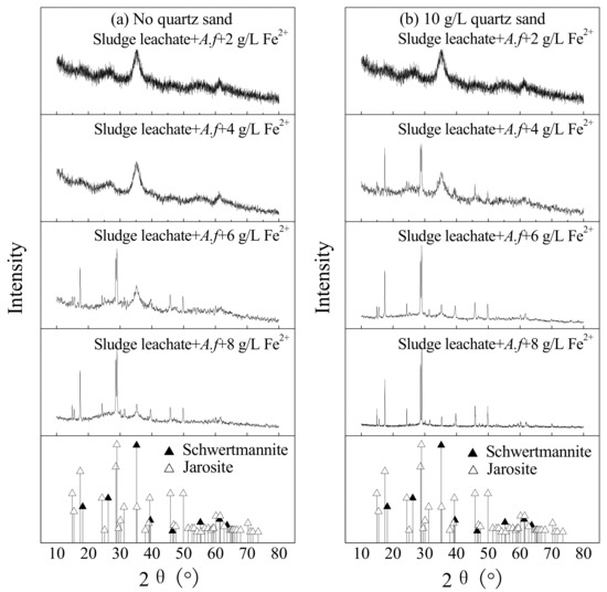The XRD pattern of biogenic secondary iron minerals under different treatments at 28 °C and 180 rpm for 120 h: (a) no quartz sand; (b) 10 g·L−1 quartz sand (initial pH = 2.55, Fe2+ concentration = 2–8 g·L−1, sludge leachate volume = 270 mL, A. ferrooxidans LX5 volume = 30 mL, A. ferrooxidans LX5 density = 5 × 107 cells·mL−1).
