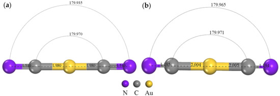 [Au(CN)2]− configuration: (a) before optimization, (b) after optimization.