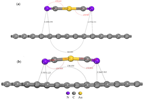 By comparing the [Au(CN)2]− configuration before and after optimization (see Figure 3), we observed that the molecular shape was always linear, and the C–Au bond length grew weakly, while the C≡N bond length increased more, which indicated that the interactions between the C and N atoms on the surface became weaker.