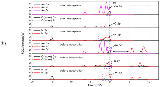 The results of the PDOS showed that there was little change in the delocalization and locality of the PDOS on the graphite (0001) surface after adsorption; however, the valence band density of the Au, C, and N atoms near the Fermi level moved slightly towards a lower energy level, mainly in the Au 5d orbital, C 2p orbital, and N 2p orbital, which suggests that the adsorption occurred mainly in the Au 5d orbital, C 2p orbital, and N 2p orbital (C≡N).