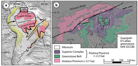 (a) Simplified geological setting of the geotectonic provinces of South America, modified after Velásquez et al. [1]. (b) A sketch map illustrating the regional geology of the Guayana Craton (Venezuela), the location of the Guri Fault, the El Callao Shear Zone, and the El Callao Mining District (modified after Velásquez et al. [1]). Dashed inset in (b) outlines the position of Figure 2.