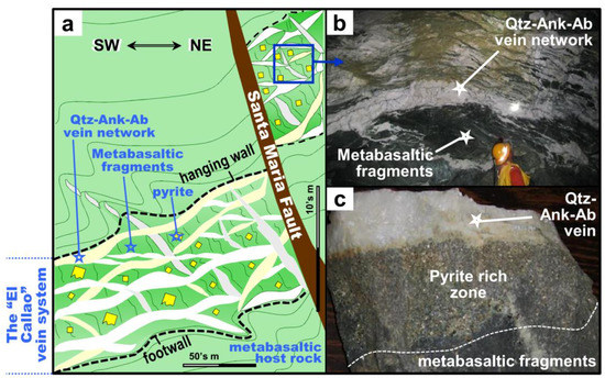 (a) Schematic illustration of the El Callao vein system, depicting the complex vein mesh and its intersection with the Santa Maria Fault (modified from Velásquez et al. [2]). (b) Underground photograph showing the interconnected veins, enclosing pyrite-rich metabasaltic fragments. (c) Photograph of a hand sample (20 cm across) showing a close-up view of a metabasaltic fragment hosting pyrite crystals, adjacent to a quartz–ankerite–albite vein.