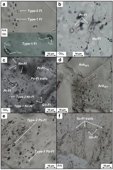 - Secondary fluid inclusions (Sc-FI): these occur within sealed microcracks that crosscut grain boundaries of recrystallized quartz and/or ankerite grains (Figure 7f and Figure 8d). This generation consists of Type-1 and Type 2 FI, which may occur next to each other. These inclusions are found in both vein network and strain fringes.