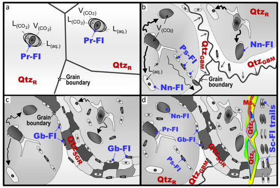 Sketches showing trapping chronologies of FI relative to mineral microstructures (a–d). (a) Pr-FI trapped within relict quartz grains (QtzR) during earliest stages of vein network formation. (b,c) Coeval dynamic recrystallization by grain boundary migration (GBM) and sub-grain rotation (SGR); (b) shows decrepitated Pr-FI within relict QtzR grains surrounded by clusters of Nn-FI and trails of Ps-FI, while (c) illustrates FI in grain boundaries (Gb-FI). (d) Sc-FI crosscutting all microstructures associated to fracturing marked by the occurrence of late muscovite (MsL).