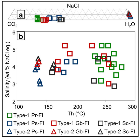 (a) A ternary diagram showing bulk CO2-H2O-NaCl ratios in all FI types and corresponding FI generations. (b) A plot of total homogenization temperature (Th(total)) versus salinity.