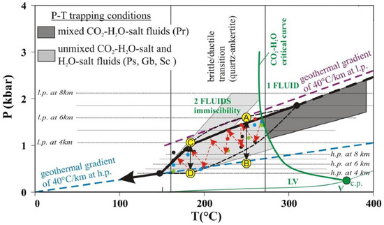 The maximum fluid pressure recorded within primary fluid inclusions (0.95 g cm−3) is 1.6 kbar and corresponds to a lithostatic load at a depth of ~6 km (Figure 10). The average homogenization temperature for such inclusions is ~270 °C, consistent with a thermal gradient of 40 °C km−1. A higher geothermal gradient would place the highest observed fluid pressures above the lithostatic geothermal gradient (Figure 10). At depths of 6 km and 270 °C, fluids are trapped at the upper limit of the DBT transition, in the ductile domain. Below these P-T conditions, the confining pressure can locally switch from lithostatic to close to hydrostatic during fracturing (red dashed arrows in Figure 10), triggering the decrepitation of primary fluid inclusions due to confining pressure drops [35], and, consequently, generating fluid expulsion. The resulting fluid is then trapped as neonate and/or pseudosecondary fluid inclusion, at pressures ranging from near-lithostatic down to near-hydrostatic (dots A to B in Figure 10), producing the wide vertical range of minimal trapping conditions, i.e., pressure drops down to 0.5 kbar at 220–270 °C (colored dots in Figure 10). At these conditions, the trails of Ps-FI were trapped in the newly-formed minerals precipitating in the strain fringes, according to the crack-seal mechanism proposed by Ramsay [36]. The trails of Ps-FI record fluid-phase separation in form of H2O-CO2-low salinity (Type-1) and H2O-salt (Type-2) FI. Such fluctuations occur down to depths of 4 km, where conditions alternated between hydrostatic and lithostatic pressure regimes (dots C to D in Figure 10). Further pressure drops during cooling resulted in repeated unmixing, which explains the heterogeneity of the CO2/H2O filling ratios of the inclusions; a process that has been evidenced in other shear zone-hosted mesozonal Au-deposits (e.g., [37,38,39,40]).