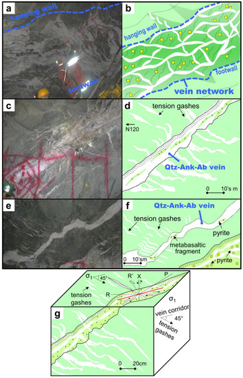 (a–f) Photographs from underground workings (a,c,e) and corresponding schematic drawings (b,d,f) illustrating sequential steps in the formation of the El Callao vein system, from early (e,f) to late (a,b) stages. (a,b) Example of quartz–ankerite–albite vein network englobing rich-pyrite metabasaltic fragments, illustrating the mature vein system. (c,d) Photograph showing the quartz–ankerite–albite veins, incorporating slivers of detached pyrite-rich metabasaltic fragments, parallel to contacts. (e,f) A satellite vein of the interconnected network associated to extensional tension gashes, illustrating early stages of vein network formation. (g) A block diagram illustrating the structural setting of the shear zone and associated network of veins and tension gashes, as well as the metabasaltic fragments containing gold-bearing pyrite. The red line on the top indicates the orientation of shear (c) plane.