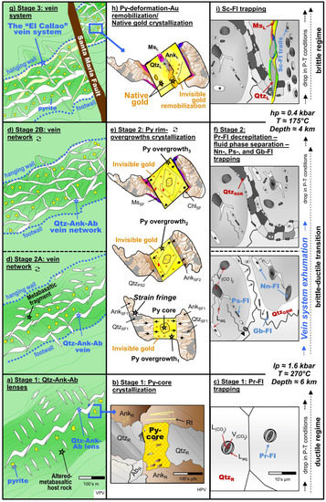 Schematic model for the El Callao vein system, temporally correlating (bottom to top) the sequence of structural events with the development of zoned pyrite crystals and fluid evolution. (a–c) Early stage of vein development, showing: quartz + ankerite + albite lenses formation (a), pyrite core crystallization (b), and primary fluid inclusions (FI) trapping (c), under ductile conditions. (d–f) Vein network formation takes place from the connection of several lenses (d), accompanied by multiple cycles of crystallization of pyrite rim-overgrowths (containing invisible gold nanoparticles) (e), (indicated by the red circular arrows), which are in turn accompanied by crystallization of gangue minerals in the empty space (indicated by the black arrows) to form strain fringes, and (f) primary-FI decrepitation. (g–i) Final stage, showing the late semi-brittle high-angle Santa Maria fault (g) crosscutting the entire vein system and subsequent fracturing of pyrite crystals (h), which are infilled by native gold grains.