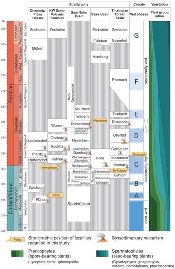 Petrified wood dating back to the late Paleozoic is known from numerous localities in Central Europe, covering a wide range of lithologies and depositional settings (Figure 1). This abundance and diversity is connected to climatic and geotectonic conditions in tropical central Pangaea, which were conducive for wood petrifaction. Initiated by climatic change from tropical ever-wet to subtropical seasonally wet conditions from the late Moscovian into the Permian (Figure 2), wood-forming gymnosperms (i.e., cordaitaleans, conifers) flourished and expanded from extra-basinal areas prone to erosion, to the basin centers [38,39]. Contemporaneously, late- to post-collisional collapse of the Variscan Mountains in Central Europe facilitated the formation of closely arranged intramontane basins, where fossils were preserved [40,41]. Rapid denudation filled the newly formed accommodation space with thick, predominantly siliciclastic successions [42]. Syndepositional explosive volcanism using intersecting faults as conduits favored rapid burial of plants, including the entombment of entire ecosystems known as “T0 assemblages” [7,43,44].