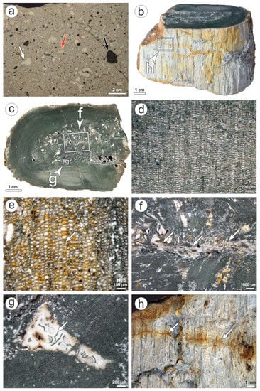 Focusing on multiphase silicifications, differences with respect to the host rock comprise of (1) the CL colors occurring in the initial phase of silicification, and (2) the timing and process of second-phase silicification. Regarding the first point, red CL is only detected in petrified woods embedded in volcaniclastic deposits (Figure 9c,d and Figure 14a,b), [30,74] described red CL in initially-silicified parts of the wood from the latest Pennsylvanian fluvial žaltman Arkoses of the Intrasudetic Basin. However, [31] specified this occurrence later as being embedded in tuffs (Table 1). Additionally, all finds showing a red CL were made in recent streams and colluvial deposits lacking their exact stratigraphic occurrence. Hence, there is no example to date for initially formed red CL in anatomically preserved plants embedded in siliciclastic rocks.