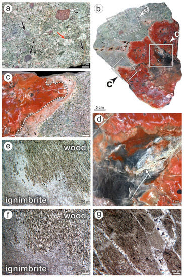 Features of K6562 and its host rock from Wendishain. (a) Ignimbrite consisting of wood fragments (black arrows), pumice (red arrow) and lithics (white arrow). (b) Cross-section showing silicified wood (red) with adhering ignimbrite (green). (c) Color zonation of the wood with an outer greyish-white to rose-colored zone 1, and an inner orange zone 2 (dotted line as border). (d) Color zonation of the wood with orange zone 2, and dark grey to brown zone 3. Note fracture fillings with ignimbrite (arrow). (e) Gradual transition from wood into ignimbrite; PPL image. (f) Same view as (e); XPL image. (g) Zone 2; XPL image. Note coarse-crystalline quartz in the fractures.