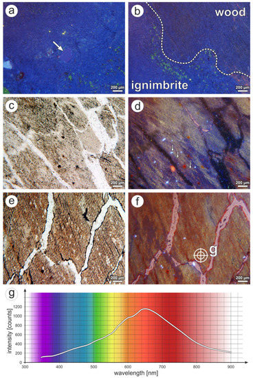 On a microscopic scale, there is a fluent transition from ignimbrite to wood, based on gradual disintegration of the tissue (Figure 6e). Silicified wood from zone 1 displays a time-dependent CL, being initially blue (decreasing 450 and 390 nm bands), and turning into red (increasing emission band at 650 nm) (Figure 7b). Fracture fillings consisting of coarse-crystalline quartz are almost non-luminescent (Figure 6g and Figure 7c,d). Towards zone 2, initially blue CL of the cell walls is gradually replaced by yellow CL (emission band at ca. 570 nm) in areas distant to fractures (Figure 7c,d). In zone 2, finally, cell walls have a yellow CL, and cell lumina are characterized by red to brown CL (main CL emission band around 650 nm) (Figure 7e,f). Fractures in areas transitional to zone 1 and within zone 2 are filled by cryptocrystalline silica showing a reddish-brown CL similar to the surrounding wood (Figure 7f).