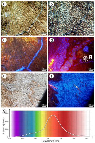 CL of K6556. (a) Anatomically well-preserved wood of the inner part of the root (type 1; PPL image). (b) Same view as in (a); XPL image. (c) CL image of (a). Note limitation of yellow CL to the former cell walls, whereas red CL occurs within the cells. Fracture filling shows a short-lived blue CL. (d) All CL spectra detected in K6556; image taken from the inner root. Note that anatomical preservation within irregularly shaped occurrences of short-lived blue CL is lower than around. (e) Anatomically poor-preserved wood of the outer rim of the root (type 2; PPL). (f) CL image of (e). Brown-luminescing agate fills holes in the wood (arrow). The occurrence of short-lived blue CL is strictly connected to cellular preservation. (g) CL spectrum taken at (d).
