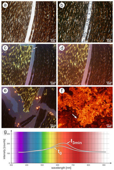 Areas of crystalline quartz in between the “points”, where anatomical preservation is low or cells are not present, are characterized by intense, short-lived blue CL resulting in non-luminescence after a few minutes irradiation (Figure 11e,f).