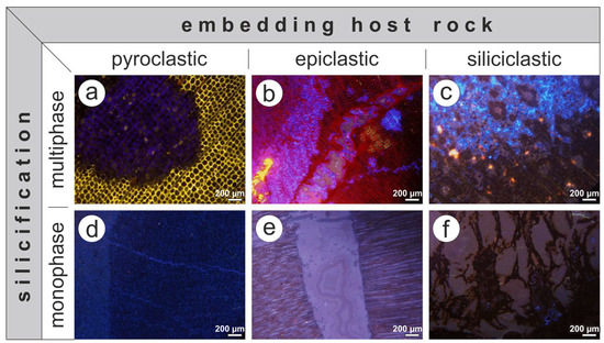 Based on the previous classification, multiphase and monophase silicifications occur in each type of embedding host rock (Figure 14). Accordingly, silicification can be accomplished stepwise (multiphase) or rapidly and completely (monophase) from the beginning.