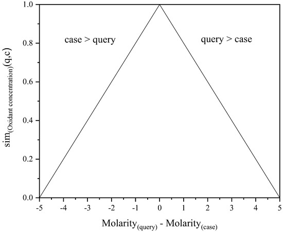 Here, x is the difference between query and case values; valuequery and valuecase. It is compared to the whole range of values in the case base for the given attribute, i.e., the difference between valuemax and valuemin. The local similarity for the attribute is the resulting value of sim. Figure 2 illustrates a linear distance function. In this hypothetical example, the values for Oxidant concentration are between 0.0 mol/L and 5.0 mol/L. Therefore, the maximum difference between two attribute values is ±5 mol/L, resulting in the x-axis ranging from −5 to 5.