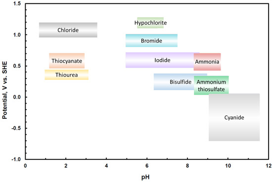 Typical potential [V vs. Standard hydrogen electrode (SHE)] and pH operating regions for gold lixiviants, redrawn after [32].