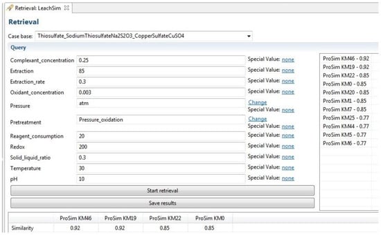 First, the LeachSim model was tested by simple queries in order to verify that the myCBR similarity calculations functioned correctly. The queries consisted of one or more attribute values and the global similarity values given by the system were compared with manual calculations to confirm the results. Second, the LeachSim’s performance in comparing the cyanide-free gold leaching process parameters was tested by artificial test queries. The aim of the performance tests was to demonstrate the functionality of the tool in retrieving scientific articles based on the user’s research interest.