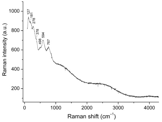 The Raman spectrum of nöggerathite-(Ce) (Figure 2) shows the absence of absorption bands of H2O molecules, OH groups, and CO32– anions. The bands in the range of 400–800 cm−1 correspond to (Ti,Nb,Zr)–O-stretching vibrations, and the bands in the range of 100–400 cm−1 are due to (REE,Ca)–O-stretching and O–(Ti,Nb,Zr)–O bending vibrations. Broad features above 900 cm−1 in the Raman spectrum of nöggerathite-(Ce) correspond to luminescence due to high amounts of REE.