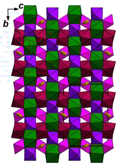 Solving the crystal structure of nöggerathite-(Ce) reveals the alternation of two types of bent polyhedral layers, namely an octahedral layer (Figure 4A) and a layer of cations with seven- and eight-fold coordination (Figure 4B). The octahedral layer is built by vertex-sharing M(3)O6 and M(4)O6 octahedra forming three- and six-membered rings, whereas M(5) and M(6) sites are located in the centers of six-membered rings. The adjacent sites M(5) and M(6), with coordination numbers 4 and 5, respectively, are statistically occupied and contain Fe2+ as the major cation (Figure 4C). The M(1)-centered polyhedron is a distorted cube which shares edges with neighboring M(1)-centered cubes to form rows along the a axis. Similar rows are formed by seven-fold M(2)-centered polyhedra (mono-capped octahedra). Adjacent rows of eight- and seven-fold polyhedra are linked with each other via common edges forming a dense layer. A general view of the crystal structure of nöggerathite-(Ce) is shown in Figure 5.