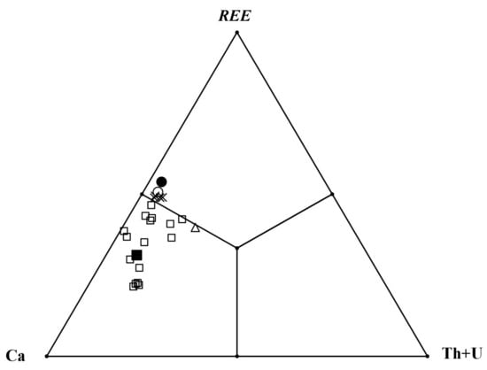 The origin of sanidinites of the Laacher See area has been discussed earlier [9,12,13,14]. These rocks are derivatives of different foyaite magmas which are comagmatic with haüyne-bearing rocks (haüyne foyaite, haüyne syenite, haüyne monzonite, etc.), or with noseane–cancrinite–nepheline syenites. Sanidinites of the latter type are enriched in rare element (Nb, Zr, REE, U, Th) accessory minerals. These rocks are cogenetic with the phonolitic host magma, and the crystallization took place in an intrusive syenite–carbonatite complex at temperatures below 700 °C in the host rock surrounding the top of the magma chamber 5000 to 20,000 years prior to the eruption of the magma chamber [12]. Most probably, nöggerathite-(Ce) and associated minerals forming crystals on the walls of cavities in sanidinite crystallized from above-critical fluid.