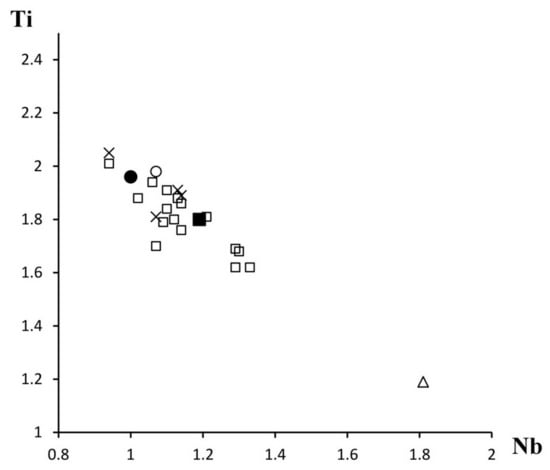 Nöggerathite-(Ce) is isostructural with zirconolite-3O and is its REE-dominant analogue, with Nb prevailing in one of two octahedral sites (see Table 5, Table 6 and Table 7). Zirconolite-3O was originally described as “polymignite” [17,18] and was later redefined and renamed [16,19,20,21]. However, “polymignite” is usually metamict and, as a rule, its powder X-ray diffraction pattern can be obtained only after calcination.