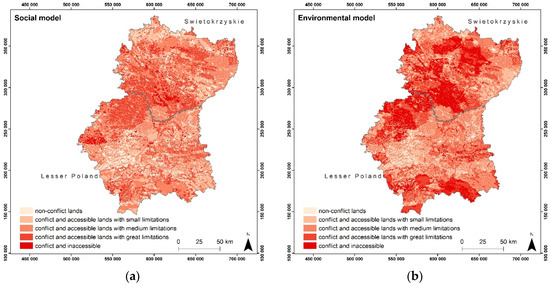 On the other hand, the range of values corresponded to each of the classes in the models, depended on the percentage share of the class area in the entire analysed area, covering the three provinces. In the case of environmental model, non-conflict accessible lands cover the range 0–2 and occupy 10.9% of the analysed area, conflict and accessible lands with small limitations cover the range 3–10 and 17.4%, conflict and accessible lands with medium limitations cover the range 11–15 and 36.2%, conflict and accessible lands with great limitations cover the range 16–21 and 22.8%, conflict and inaccessible lands cover the range 22–52 and 12.7%. In the case of social model, non-conflict accessible lands assume value from the range 0–1 in the gridcode field and occupy 13.7% of the analysed area, conflict and accessible lands with small limitations cover the range 2–4 and 19.6%, conflict and accessible lands with medium limitations cover the range 5–11 and 43.1%, conflict and accessible lands with great limitations assume values of the gridcode equal to 12–15 and 19.6%, while conflict and inaccessible lands cover the range 16–58 and 4.0% of area. Width of the classes was mainly dictated by the condition that the boundary classes, compared to the remaining classes, occupy the smallest area of the analysed terrain. The class with the largest area in the case of both models was the middle class of accessibility. Impediment in the selection of class ranges—so that each of them in both models occupies the same area, was the assumption of the total gridcode values (the values change stepwise). However, this was necessary due to the need to convert the data to a vector format. The detailed classification for the environmental and social model is shown in Figure 4.