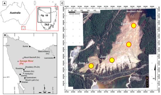 (A) Location of Tasmania in Australia; (B) Location of Savage River in Western Tasmania showing the location of other major mines and their commodities; (C) Image of the Old Tailings Dam (OTD) with the location of samples collected in this study marked with yellow circles.