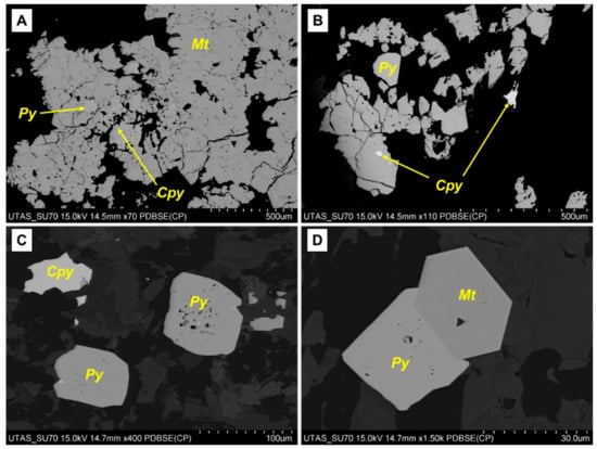 Operations consist of five open cut workings exploiting a group of magnetite-rich lenses irregularly distributed within a series of highly metamorphosed rocks of marble, schist and metabasic rocks [37,38]. Urqhart [37] described magnetite as associated with amphibolite or disseminated in meta-sediment. Urquart [37] also stated that folded, steeply dipping Precambrian Whyte Schist underlies most of the area and is separated by an inferred major fault from less metamorphosed and deformed Precambrian Corinna Slate to the SW. Urqhart [37] and Coleman [38] identified pyrite as the dominant gangue sulphide often forming irregular grains up to 3 mm across. It can occur ophiolitically overgrown with small blades of actinolite or tremolite, and intergrown in coarser areas of magnetite as seen in Figure 2A. Urqhart [36] described chalcopyrite as restricted to pyrite where it occurs as ‘bleb’ like inclusions (Figure 2B) and as small interstitial patches or discontinuous seams in grain boundaries at the contacts of pyrite with either magnetite or other gangue phases [37,38]. Our investigations show that isolated chalcopyrite grains associated with silicate gangue, as shown in Figure 2C, and similar-sized pyrite-magnetite associated grains are also present, as seen in Figure 2D.
