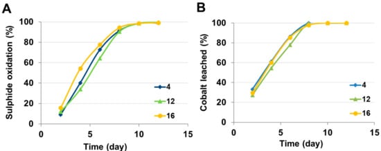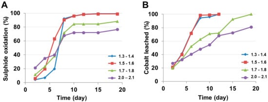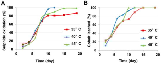 In contrast, oxidation progress dropped from day 8 onwards at 35 °C with a near-cessation of activity from day 10 onwards with only 86% oxidation achieved by day 19, as seen in Figure 4A. It is likely that the other mesophilic bacteria present are better adapted to warmer conditions, as prior to adaption the bacteria had been kept in a stock tank where the temperature was held at 40 °C. Indeed, as seen in Figure 4A, at 40 °C, the oxidation rate remained reasonably consistent for the duration of the experiment with 100% oxidation achieved by day 12. Co leaching shows greater efficiency at higher temperatures with > 95% by day 10 but can be seen to have evolved generally over three stages (best shown at 35 °C). Initially, the mesophilic bacteria are active, next, oxidation rate begins to diminish and finally, bacterial growth rate declines, as seen in Figure 4B [23].