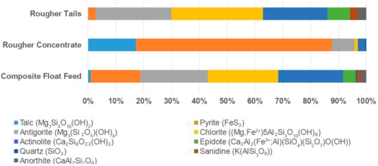 After flotation, approximately 70.5% pyrite was measured in the rougher concentrate, however talc was also concentrated by this process, increasing from 1 wt % in the tailings composite to 17 wt %. Antigorite (8 wt %), actinolite (3 wt %) and trace chlorite were also identified as shown in Figure 6. Magnesium silicates are common gangue components in sulphide ores with their presence inhibiting metallurgical recovery [48]. The mineralogy of the rougher tailings was like that of the composite feed with chlorite (32 wt %), antigorite (27 wt %) and actinolite (23 wt %). Pyrite was still present as a minor component (2 wt %; Figure 6) and remains classified as potentially acid forming (PAF) although the relative neutralising potential had increased by 8 kg H2SO4/t compared to the tailings feed as seen in Table 2. These results highlight that the efficiency of the initial float must be improved to generate an inert ‘new’ tailings product.