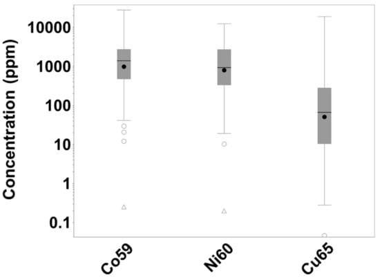 Box and whisker plot (n = 143) showing cobalt, nickel and copper concentration in pyrite from the rougher concentrate (NB. the box covers the interquartile range, the line is the median and the circle the mean. The whiskers are drawn at the threshold to identify near and far outliers based on the Tukey statistic).