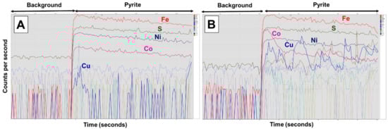Examples of laser ablation ICPMS (LA-ICPMS) traces for pyrite contained in the rougher concentrate. (A) Co and Ni appear as refractory within pyrite as their trace is roughly similar to that for Fe and S; (B) Cu inclusions are seen within pyrite (i.e., appearance of large spikes) with Co showing zoning in the pyrite grain.